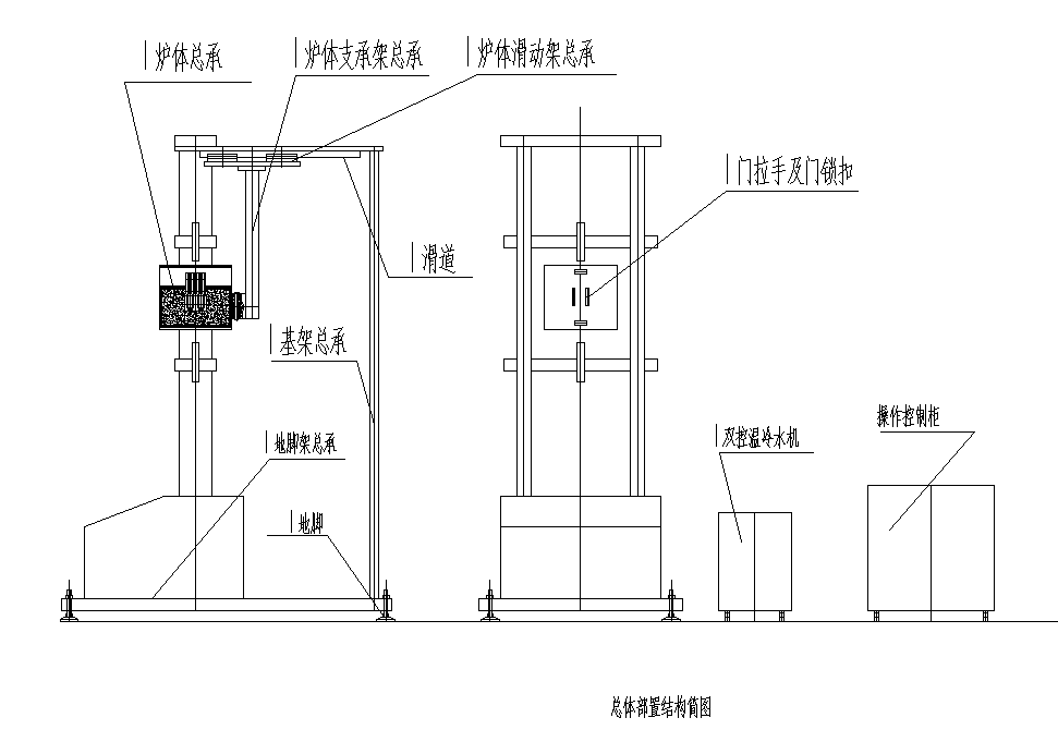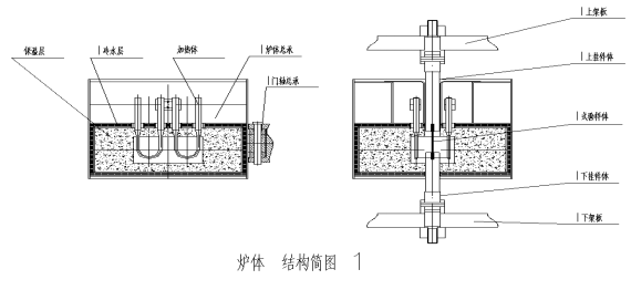 1)高溫爐體  為了讓用戶方便安全的更換試樣,采用水冷、可移動、對開式的爐體結(jié)構(gòu)(具體見簡圖1).爐體及爐蓋采用雙層不銹鋼的焊接結(jié)構(gòu),總厚度約為15mm,中空通流動水。具有開門斷電功能。